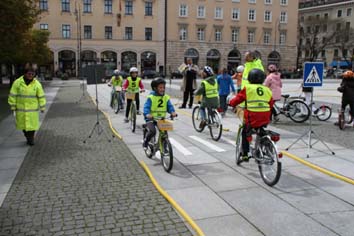 Die Verkehrspolizeiinspektion Verkehrserziehung und -aufklärung und Schülerinnen und Schüler der Grundschule an der Türkenstraße zeigten mit praktischen Vorführungen auf dem Wittelsbacherplatz was alles möglich ist, um den Schulweg sicherer zu machen.